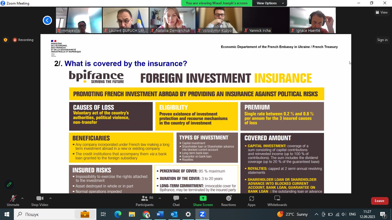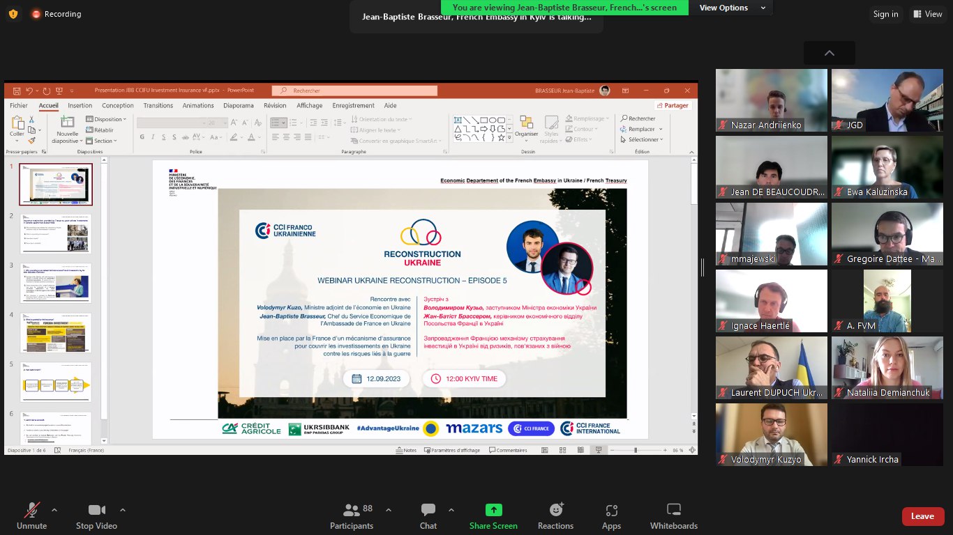 Beau succès ce matin pour notre cinquième webinaire dédié à la reconstruction et à la résilience de l'économie ukrainienne. Nous avons eu le plaisir de recevoir Volodymyr Kuzo, Ministre adjoint de l’économie en Ukraine et Jean-Baptiste Brasseur , Chef du Service Economique de l’Ambassade de France en Ukraine sur le thème : « Mise en place par la France d'un mécanisme d'assurance pour couvrir les investissements en Ukraine contre les risques liés à la guerre ».