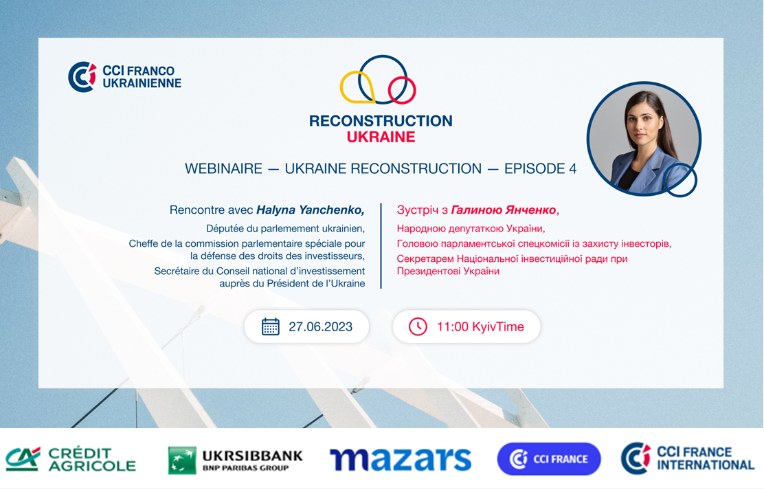 Pour ce quatrième épisode de notre série de webinaires ? dédiée à la reconstruction de l’Ukraine nous avons l’immense plaisir de vous inviter à une rencontre avec Галина Янченко, Députée du parlemement ukrainien, Cheffe de la Commission parlementaire spéciale pour la défense des droits des investisseurs, Secrétaire du Conseil national d’investissement auprès du Président de l’Ukraine qui interviendra sur le thème :
