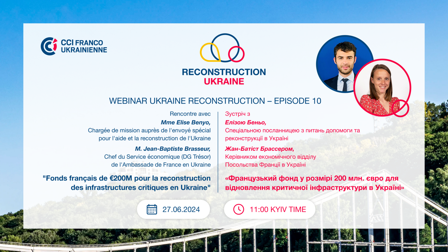 Dans le cadre de son dixième webinaire dédié à la reconstruction de l'Ukraine, la CCI franco-ukrainienne a le plaisir de vous convier à une conférence en ligne avec Mme Elise Benyo, Chargée de mission auprès de l'envoyé spécial pour l'aide et la reconstruction de l'Ukraine et M. Jean-Baptiste Brasseur, Chef du Service économique (DG Trésor) de l'Ambassade de France en Ukraine